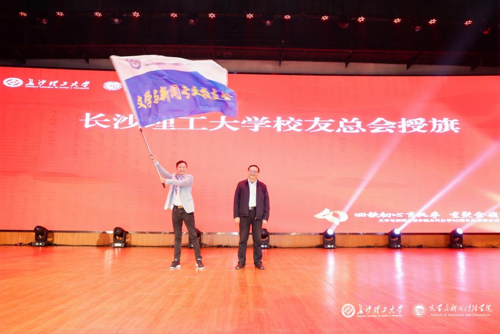 副校长、学校校友总会副会长刘朝晖代表学校致辞,对莅临大会的嘉宾和校友致以热烈的欢迎,并给刚刚成立的文学与新闻专业校友会授旗。