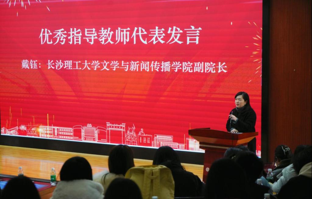 颁奖典礼中,戴钰作为优秀指导教师代表发言。她从推动马克思主义新闻观研究“实”起来、马克思主义新闻观教育“活”起来、马克思主义新闻观研究成果“亮”起来等方面分享了参与指导征文活动的感悟。鼓励学生从书屋走向田野、走向中国大地,使新闻青年与中国社会深度融合,让学生们透彻理解新闻背后所承载的重大社会责任。