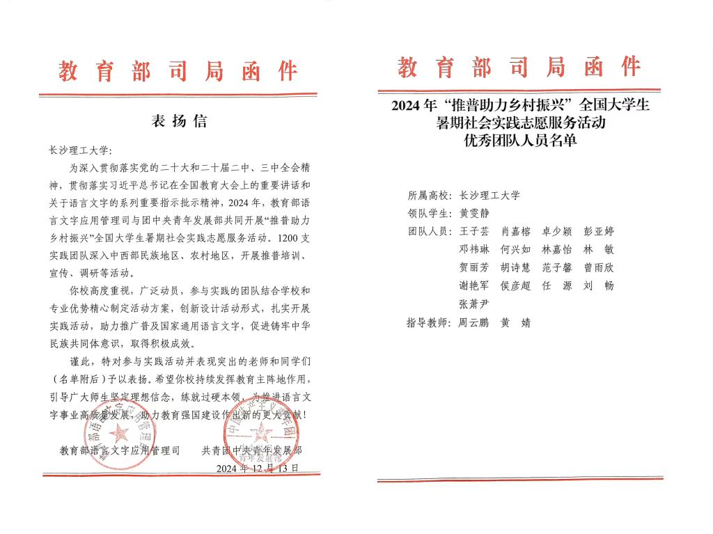 近日,由教育部语言文字应用管理司、共青团中央青年发展部联合开展的2024年“推普助力乡村振兴”全国大学生暑期社会实践志愿服务活动评选结果揭晓,由文新学院组织赴湖南省邵阳市新宁县的“‘语润坪山’长沙理工大学赴新宁县推普助力乡村振兴”服务队从全国1200支团队中脱颖而出,获评优秀团队,教育部语言文字应用管理司和共青团中央青年发展部来信表扬。
