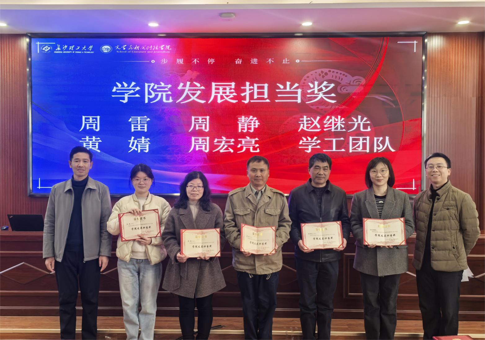 会议举行了教师荣休及年度突出贡献奖表彰仪式。周雷、周静、赵继光、黄婧、周宏亮、学工团队获学院发展担当奖。