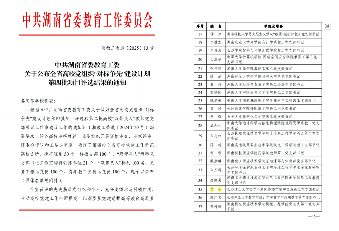 近日,中共湖南省委教育工委公布全省高校党组织“对标争先”建设计划第四批项目评选结果,我院中文系教工党支部书记黄莹老师荣获全省高校党建工作“双带头人标兵”称号。