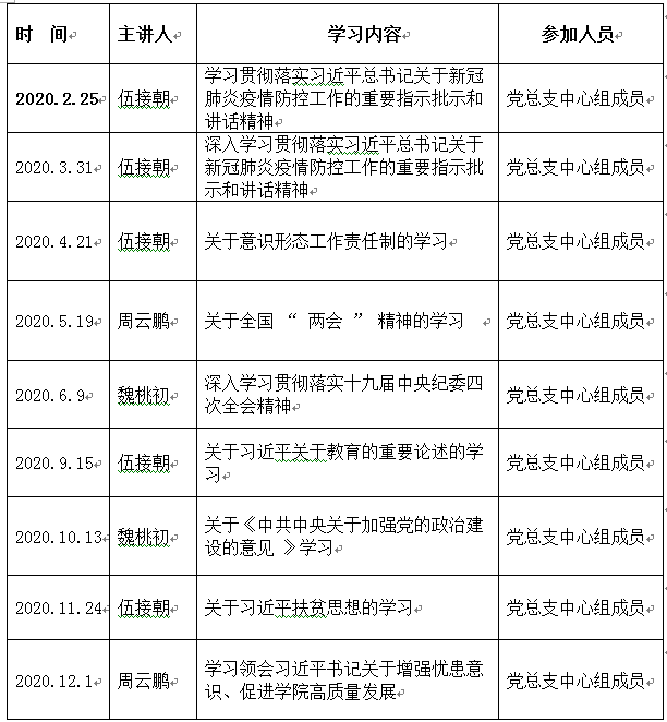 为落实学校关于《长沙理工大学2020年度两级党委中心组理论学习安排》通知的要求,深入学习贯彻习近平新时代中国特色社会主义思想,坚持思想建党、理论强党,进一步加强学院党的政治建设,提高领导班子的党性修养、政治素养和理论水平,根据当前理论学习的形势和任务,结合学院年度工作要点,现将文新系2020 年党总支中心组理论学习安排如下: