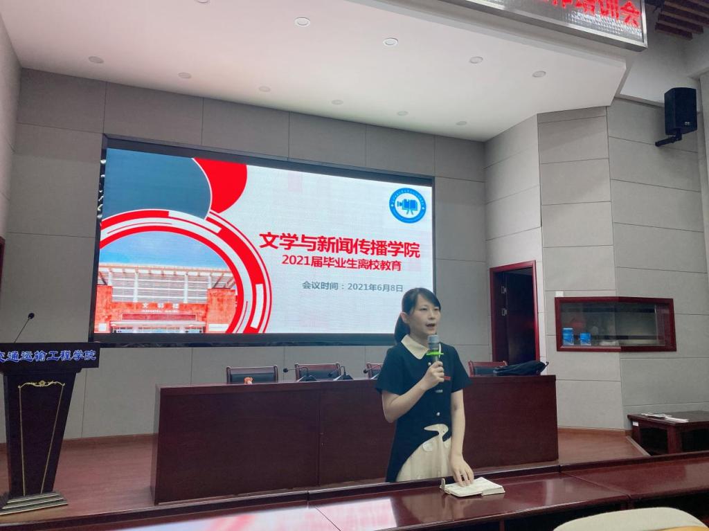 2021年6月8日晚,文学与新闻传播学院在长沙理工大学云塘校区工二B310开展了2021届毕业生离校教育主题教育。本次主题教育由2017级辅导员陈鑫宇主持,文新学院党委副书记刘莎、文新学院学工办主任楚艳鸽出席本次会议。