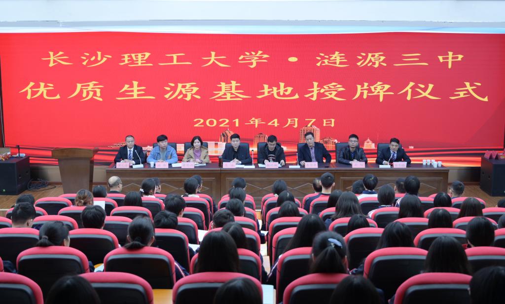 4月7日,在涟源市教育局、团市委的大力支持下,长沙理工大学教师代表赴涟源市三中和六中开展高校高中“结对子”暨优质生源基地授牌仪式。长沙理工大学文新学院副院长魏桃初、教师代表楚艳鸽,法学院教师代表刘阳,涟源市教育局局长朱智华、副局长梁丹、团市委副书记包涵、三甲乡团委书记刘都及两所高中全体校领导出席相关活动,近四百余名高中学子到场学习。此次签约仪式简约而不简单,仪式之后展开的面对面互动更是激发起了同学们对长沙理工大学的好奇与对大学生活的向往。