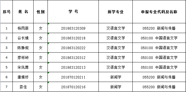 根据长沙理工大学研究生院《关于做好2021年研究生校内优秀生源培养工作的通知》精神,经学生申请,系资格审查,确定下列7名同学为文学与新闻传播学院2021年研究生校内优秀生源培养对象,现予以公示。公示时间:2021年9月18日-23日,如有异议,请向学院科研与研究生办公室反映,电话: 85255728。