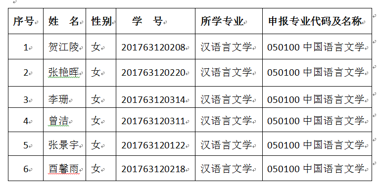 根据长沙理工大学研究生院《关于做好2020年研究生校内优秀生源培养工作的通知》精神,经学生申请,系资格审查,确定下列6名同学为文学与新闻学系2020年研究生校内优秀生源培养对象,现予以公示。公示时间:2020年9月20日-22日,如有异议,请向系科研与研究生办公室刘老师反映,电话: 13975803169。