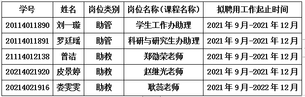 根据长沙理工大学研究生“三助一辅”工作管理办法,经自主申报、导师推荐、设岗单位同意、学院审核,现将2021-2022学年第一学期拟聘用研究生“三助一辅”岗位名单公示如下: