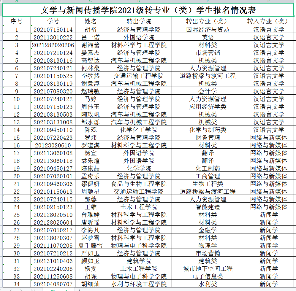 根据《长沙理工大学本科生转专业管理办法》和学校《关于做好2021级在校本科生转专业(类)工作的通知》要求,学院接收转入我院的2021级学生报名。报名学生名单如下,现予以公示。公示期三天,公示时间为4月14日至4月16日。如有异议,请向学院教务办反映,电话85256150 黄老师。