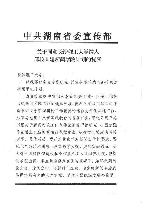 3月12日,湖南省委宣传部下发《关于同意长沙理工大学纳入部校共建新闻学院计划的复函》,决定将长沙理工大学文学与新闻传播学院纳入部校共建新闻学院行列。
