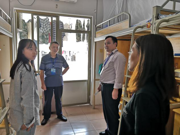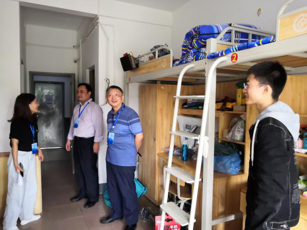 在新生寝室里,伍接朝书记亲切地与新生交流,全面了解寝室入住和硬件设施情况,并询问其生源地、适应学校的情况及未来目标,并对个别寝室出现的自来水不通、电线掉落等问题现场联系相关部门沟通解决。