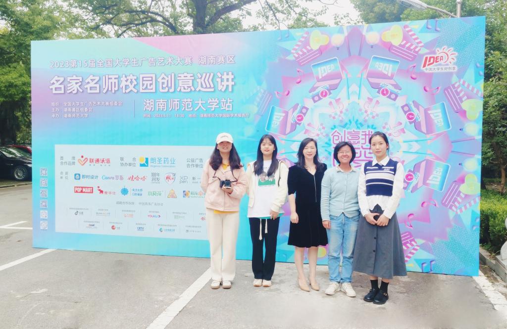 2023年5月11日下午,第15届全国大学生广告艺术大赛湖南赛区名家名师校园创意巡讲在湖南师范大学举行。文新学院副院长戴钰、教师代表黄琳达与部分新闻学专业学生参加了本次巡讲活动。