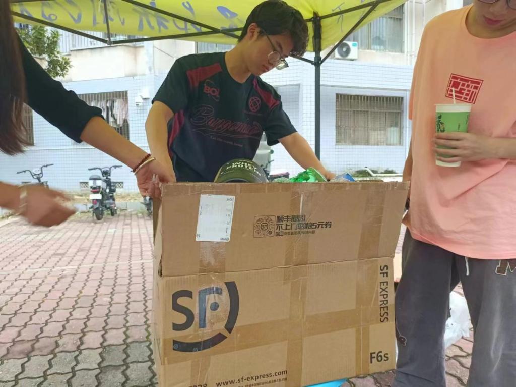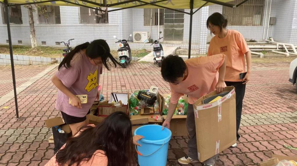 在活动现场,同学们以寝室为单位,将收集好的纸箱、废纸、塑料瓶、易拉罐等可回收物品带至活动现场。在工作人员的引导下,大家有序地将废旧物品进行分类、称重,最后交给宿舍栋长统一处理。活动现场气氛热烈,同学们积极参与,不仅展现了对环保的热情,也体现了团队合作的精神。许多寝室通过创意改造废旧物品,将它们变成了实用的生活用品或装饰品,充分展示了同学们的创新能力和动手能力。