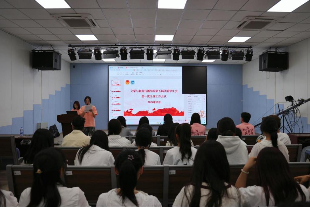 10月25日晚7点,文新学院在金盆岭校区九教113大厅举行第五届团委学生会第一次全体大会,院分团委书记杨雅蒙及第五届团委学生会全体成员参加。