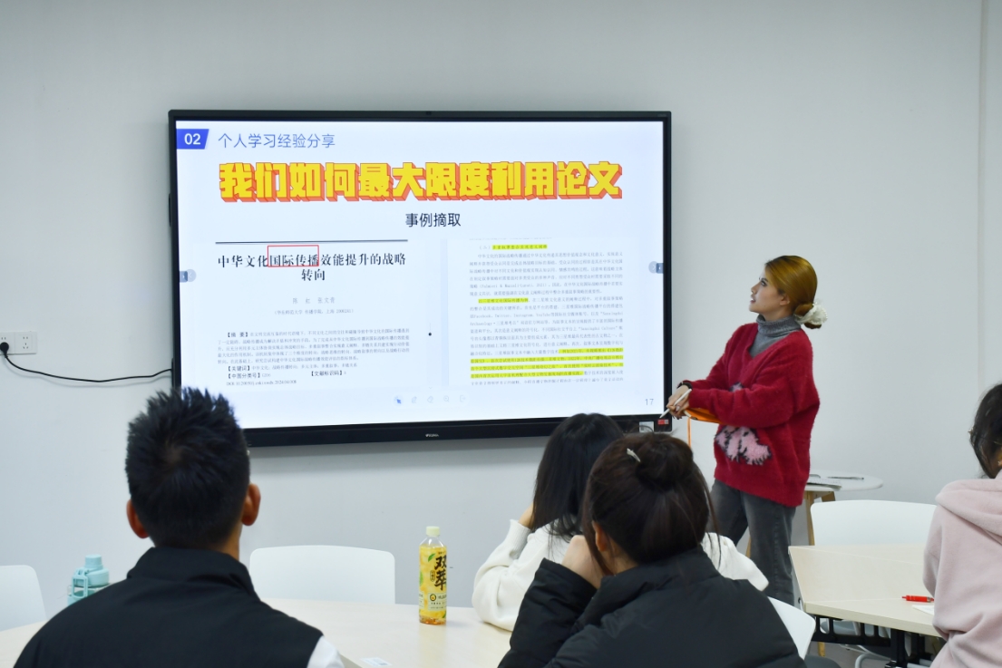 在分享环节,邓雅文讲述了她的个人保研经历,同时向同学们提出两个小问题以强调论文的重要性。随后,她以一篇优秀论文为例详细讲述了如何寻找、如何阅读、如何最大限度利用论文的方法与途径。她鼓励同学们多阅读论文,增加论文的存储量,并多加以理解和运用,提升自我的综合能力。关于新闻专业的相关学习方向,她向同学们展示了自己做的思维导图,建议同学们在学习时多构建思维导图,并借思维导图回忆知识点。
