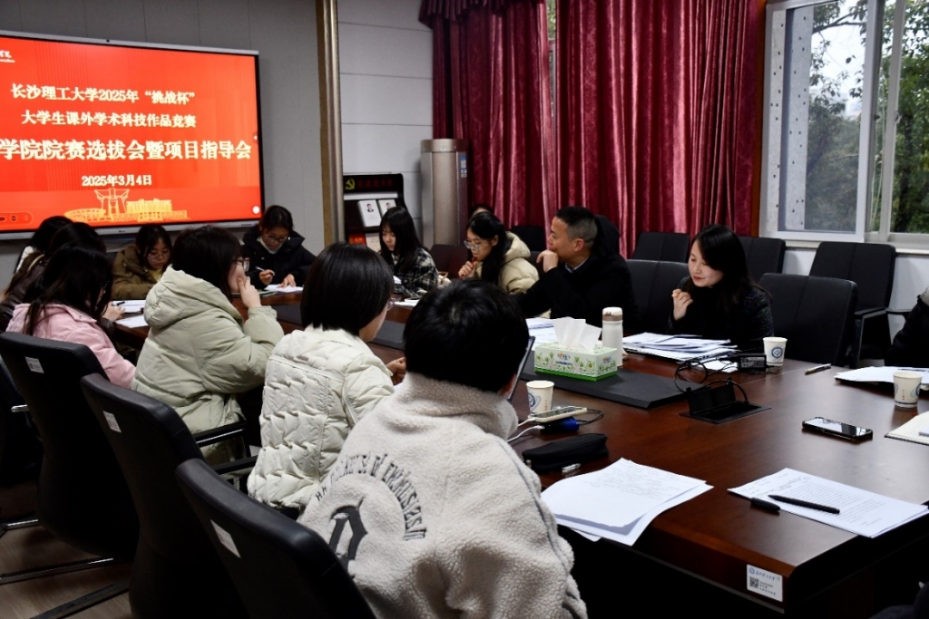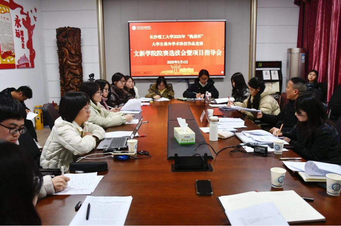 2025年3月4日16时30分,文学与新闻传播学院于九教321会议室召开了2025年“挑战杯”大学生课外学术科技作品竞赛文新学院院赛选拔会暨项目指导会。此次会议荣幸邀请到了长沙理工大学经济与管理学院的黄维教授进行项目指导,党委副书记刘莎、党委委员兼中文系主任侯承相以及团委书记项永生均出席了本次会议,部分师生代表也参与了此次会议。