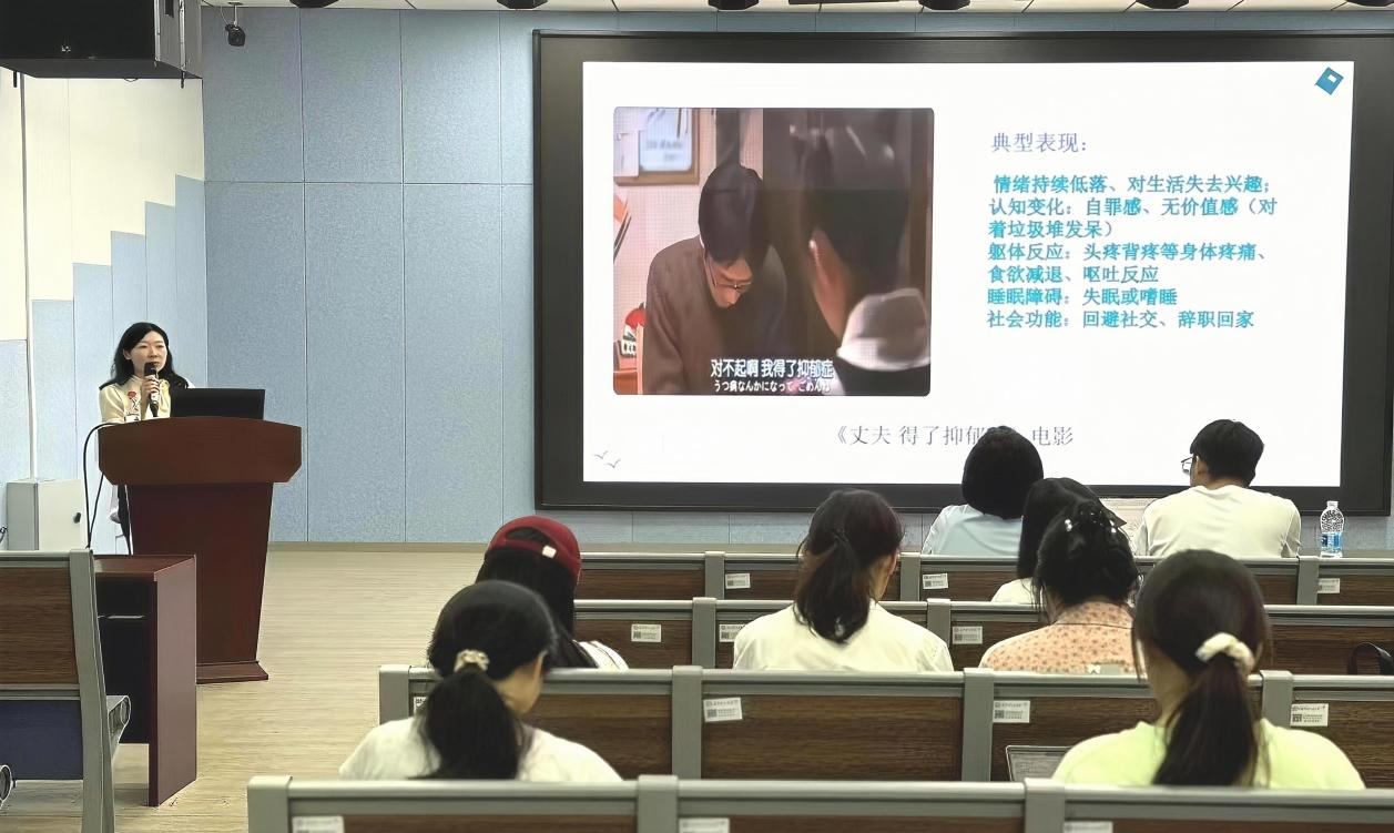 禹敏围绕心理问题识别与危机干预两大主题展开讲解。她首先分析了抑郁症和双相情感障碍的特征,强调要消除对心理疾病的偏见。接着重点讲解了如何识别三大心理危机信号:持续情绪异常、危险行为倾向以及透露就医或轻生念头。最后,她要求互助员必须遵循“第一时间发现立即报告辅导员”的原则,严守保密规定,配合专业力量进行干预。