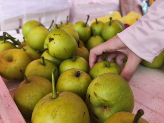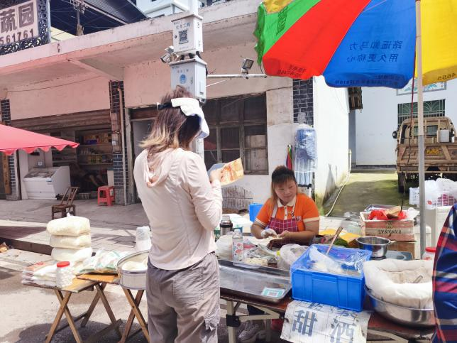 6月29日早上九点半,梭子丘村十天一次的市集已然人头攒动。文新学院“文梭新韵”实践团成员在水果摊前停下脚步,一颗本地李子入口,甜味稀薄,果肉微涩。