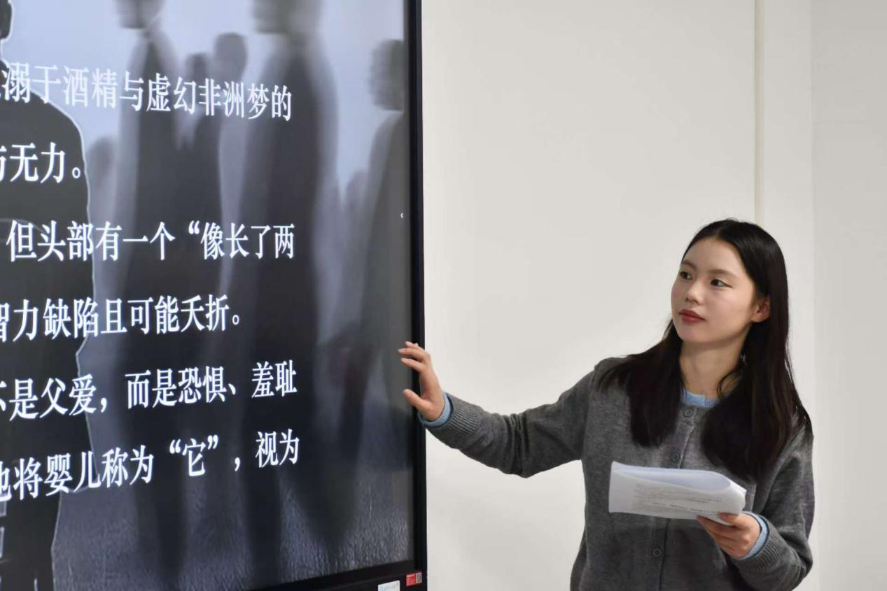 分享会伊始,李诗婷以书中“当个体遭遇无法承受的生命之重,该如何寻得前行的微光?”这一问题切入,迅速将现场氛围带入对《个人的体验》的深度探讨。随后,她循着“作者创作背景—小说内容梗概—核心人物困境—‘生命微光’主题拆解”的脉络层层展开,重点围绕主人公鸟在人生困境中的挣扎、对“个人体验”的迷茫与探寻,让同学们真切感受到作品中“面对与逃避”“个体痛苦与生命力量”的深层矛盾,读懂“生命微光”并非耀眼光芒,而是藏在日常选择里的勇气。