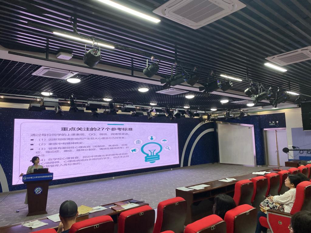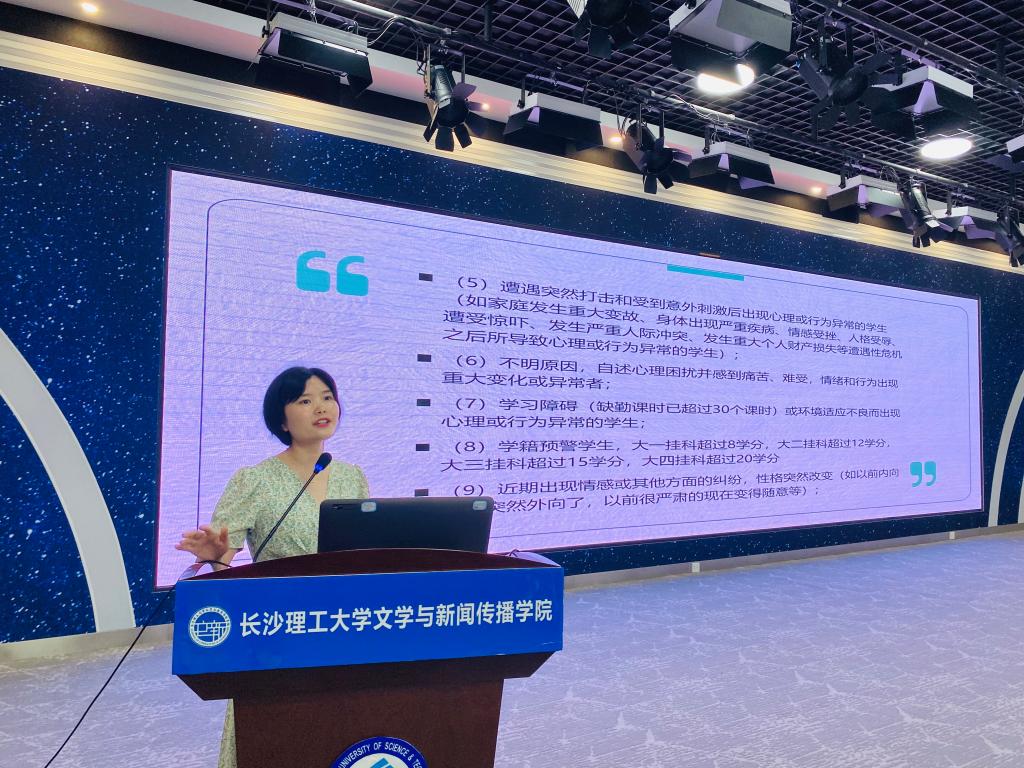 5月30日下午,我院心理辅导员楚艳鸽于文科楼B300全媒体实训中心面向文新学院班主任和硕士生导师开展心理健康教育知识专题培训。