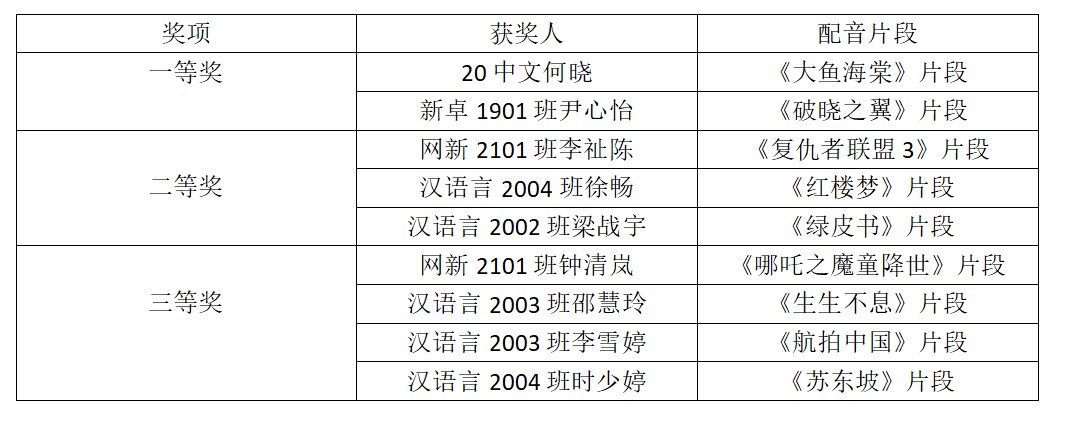 本次大赛面向长沙理工大学全体学生,共分为线上作品征集、评选与公布三个部分。经过评委的一系列评选,共评选出一等奖两名、二等奖三名和三等奖四名,并于文新学院公众号“文语新苑”公布优秀配音作品,以示鼓励。本次配音大赛圆满结束。