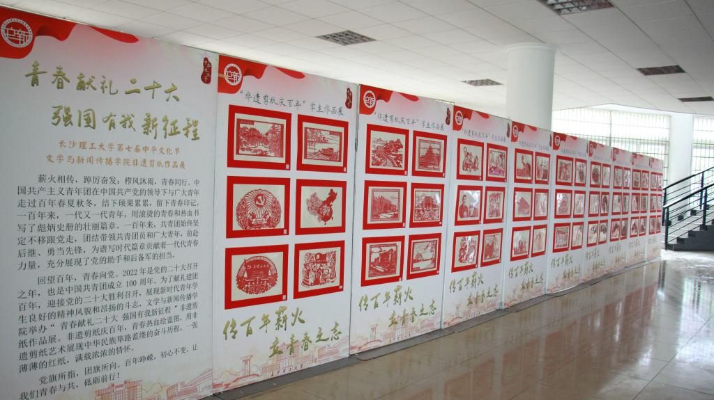 2022年是中国共青团成立的100周年,也是党的二十大召开之年。为了献礼建团百年,迎接党的二十大胜利召开,展现新时代青年学生良好的精神风貌和昂扬斗志,长沙理工大学文学与新闻传播学院以非遗剪纸艺术为依托,举办“青春献礼党的二十大,强国有我新征程”剪纸作品展。