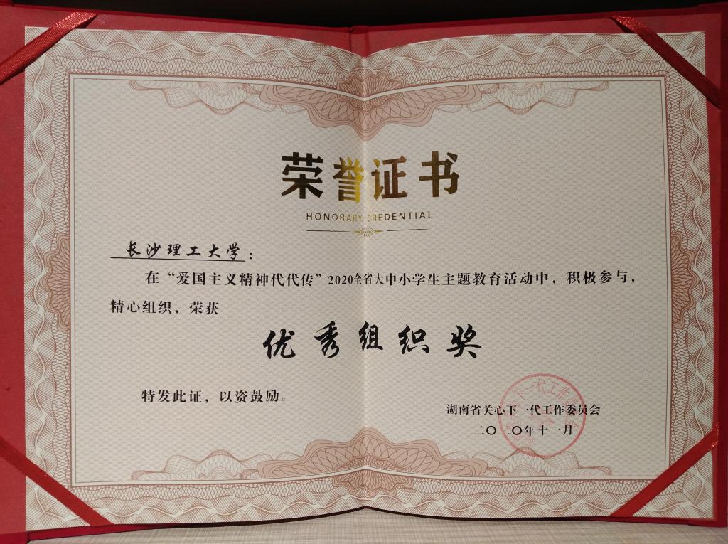 长沙理工大学积极响应省关工委号召,组织开展了系列活动,在“爱国主义精神代代传”主题教育活动成果展中荣获“优秀组织奖”。文学与新闻学系楚艳鸽老师在活动中表现突出,荣获“优秀指导老师奖”。曾峥同学和赵雅芝同学在活动中表现优异,荣获“优秀学生奖”。(文、图:原雅楠,审:楚艳鸽)
