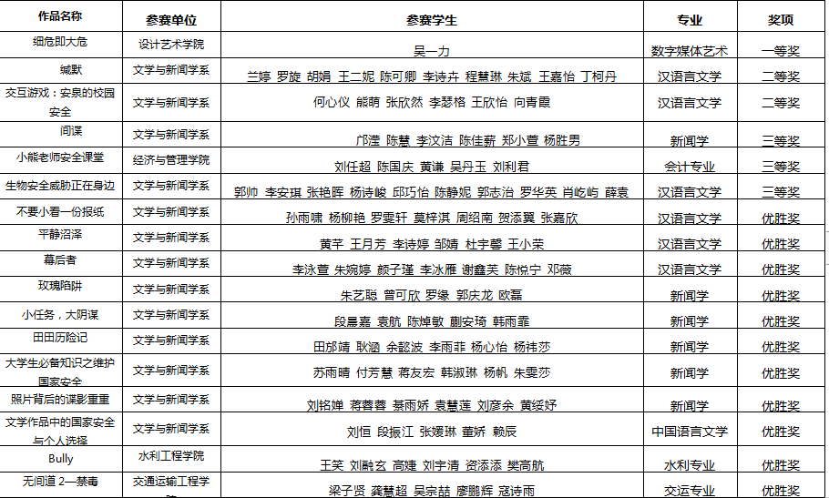 为进一步增强学生的国家安全意识,推进国家安全教育进校园、进课堂、进头脑,营造学生良好的自觉履行维护国家安全责任义务和教育的氛围,切实增强广大师生维护国家安全的意识和能力,雷竞技官网在全校范围内开展了国家安全教育主题微视频比赛。本次微视频活动秉承自愿参加原则,经过初赛、决赛层层选拔,作品《细危即大危》荣获校级一等奖;《缄默》、《安泉的校园安全》荣获校级二等奖;《间谍》、《小熊老师安全课堂》、《生物安全威胁正在身边》等3个作品荣获校级三等奖;《小任务、大阴谋》等11个作品荣获优胜奖。