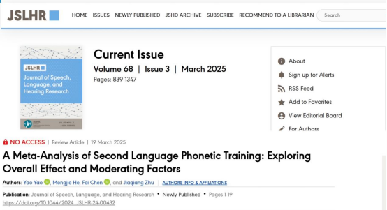 论文信息:Yao Yao, Mengjie He, Fei Chen & Jiaqiang Zhu. A Meta-Analysis of Second Language Phonetic Training: Exploring Overall Effect and Moderating Factors. Journal of Speech, Language and Hearing Research. (2025).