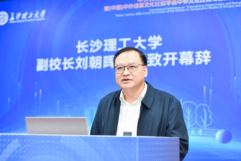 长沙理工大学副校长刘朝晖教授在开幕式致辞,对大会的召开致以热烈祝贺,向全球与会专家学者表达诚挚欢迎,并衷心感谢各界长期以来对学校及外国语学院建设发展的关心支持。他指出,中外语言文化比较学会深耕三十余载,为繁荣国家文化事业、促进中外文明交流互鉴作出了重要贡献。其中,中外文论比较专业委员会搭建的跨域交流平台成果丰硕、广受赞誉。本次会议既能体现本领域研究的理论高度,又敏锐把握了时代脉搏。长沙理工大学作为一所特色鲜明的多科性大学,外国语言文学学科是学校高质量发展的重要组成部分。外国语学院承办此次会议既是学习交流的契机,更是服务文化传播所应该担负的责任。他特别以毛泽东《沁园春・长沙》的豪迈意境呼应此次“百侣来游”的学人相聚,期许共拓中外文论研究新境界。
