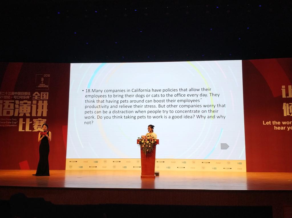 4月12日至15日,第二十三届中国日报社“21世纪 •可口可乐杯”全国英语演讲比赛(大学组)总决赛在杭州师范大学举行。来自中国大陆及港澳台地区的72所高校选手齐聚杭州展开激烈角逐。雷竞技官网2016级环境工程专业学生余大婷在外国语学院公共外语部谷丰老师的指导下参加了比赛。