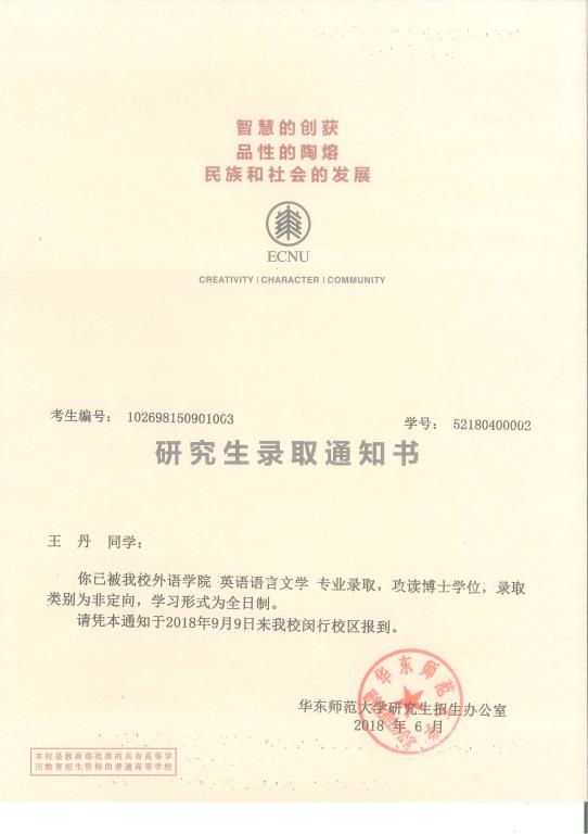 近日,我院黄坚教授指导的硕士研究生王丹同学收到了华东师范大学博士研究生的录取通知书,被录取到该校外语学院英语语言文学专业攻读博士学位,实现了我院应届硕士毕业生考取博士研究生零的突破。