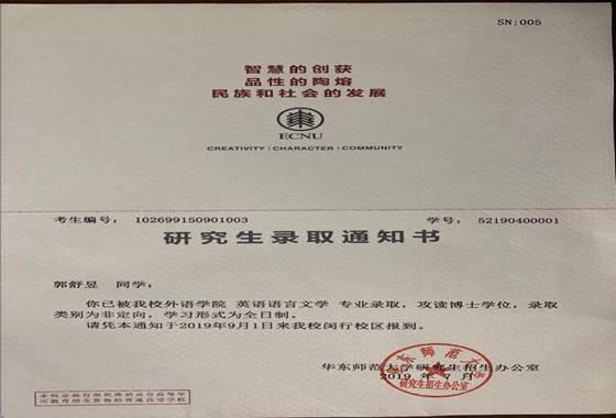 近日,我院黄坚教授指导的硕士研究生郭舒昱同学收到了华东师范大学博士研究生的录取通知书,被录取到该校外语学院英语语言文学专业攻读博士学位。我院继去年实现应届硕士毕业生考取博士研究生零的突破后再创佳绩。