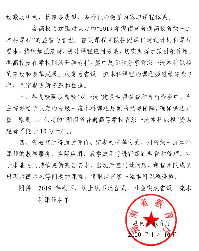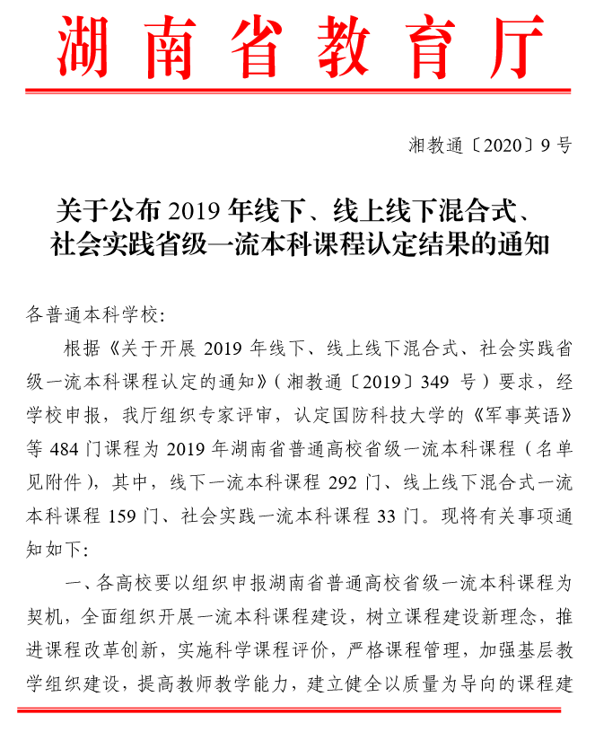 近日,湖南省教育厅(湘教通〔2020〕9 号 )颁布《关于公布 2019 年线下、线上线下混合式、 社会实践省级一流本科课程认定结果的通知》,全省共有484 门课程被认定为2019 年湖南省普通高校省级一流本科课程,长沙理工大学共获批15门,其中包括我院黄坚教授申报的《通用工程英语听说》。这是继我院英语专业入选省级一流本科建设专业点以来,我院专业建设取得的又一重大突破,并且下一步将上报教育部冲击国家一流本科课程。