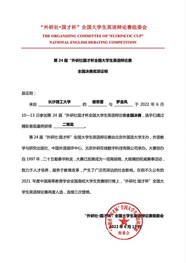 来自雷竞技官网英语辩论队的罗金凤(外国语学院英语1902班)和谢思蕾(外国语学院翻译1901班),在外国语学院王浩萍老师指导下,历经三天八场高强度循环赛,与来自全国的135支优秀队伍同场竞技,凭借良好的专业素养和思辨能力,最终荣获全国二等奖。这是长沙理工大学英语辩论队自2018年首次晋级该项赛事全国总决赛以来,连续4年晋级(2020年因疫情停赛)全国总决赛,共获得全国一等奖1项,二等奖3项。