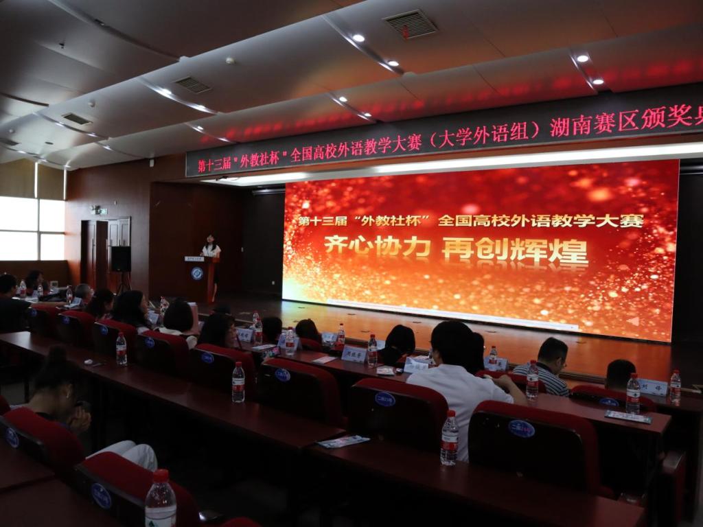 决赛颁奖典礼于19日上午11点30分在云塘校区国际学术交流中心二楼科技报告厅举行,出席本次活动的领导老师有长沙理工大学副校长曾祥君教授、全省的外语类专家教授、各参赛校领队、参赛选手及团队成员们。首先,长沙理工大学副校长曾祥君教授代表长沙理工大学全校师生向大赛组委会表示感谢,寄语青年教师要积极提升教学能力和业务水平,为“共建共享我省大学外语教师教学新思想、新理念与新方法的学习与交流平台,为雷竞技官网、为全省高校的人才培养做出积极贡献。”上海外语教育出版社孙玉社长通过视频送来了祝贺致辞,湖南省普通高校外国语言文学类专业教学指导委员会主任刘正光教授、大学英语视听说组评审组组长梁晓波教授和高等教育学会日语专业委员会会长、大学日语组评审组组长张佩霞教授则分别代表各组评委会对参赛选手的表现进行了兼具高度、深度和广度的点评,同时结合新《指南》对高校教育提质培优背景下未来省内院校外语教师的发展提出了新的要求。