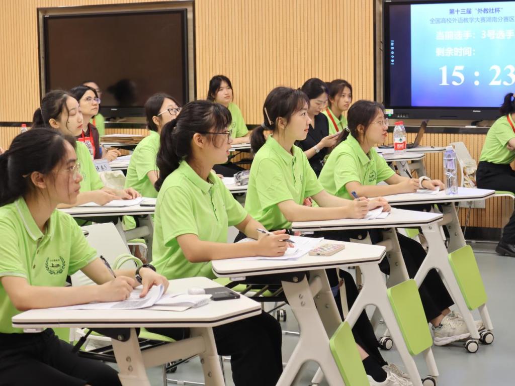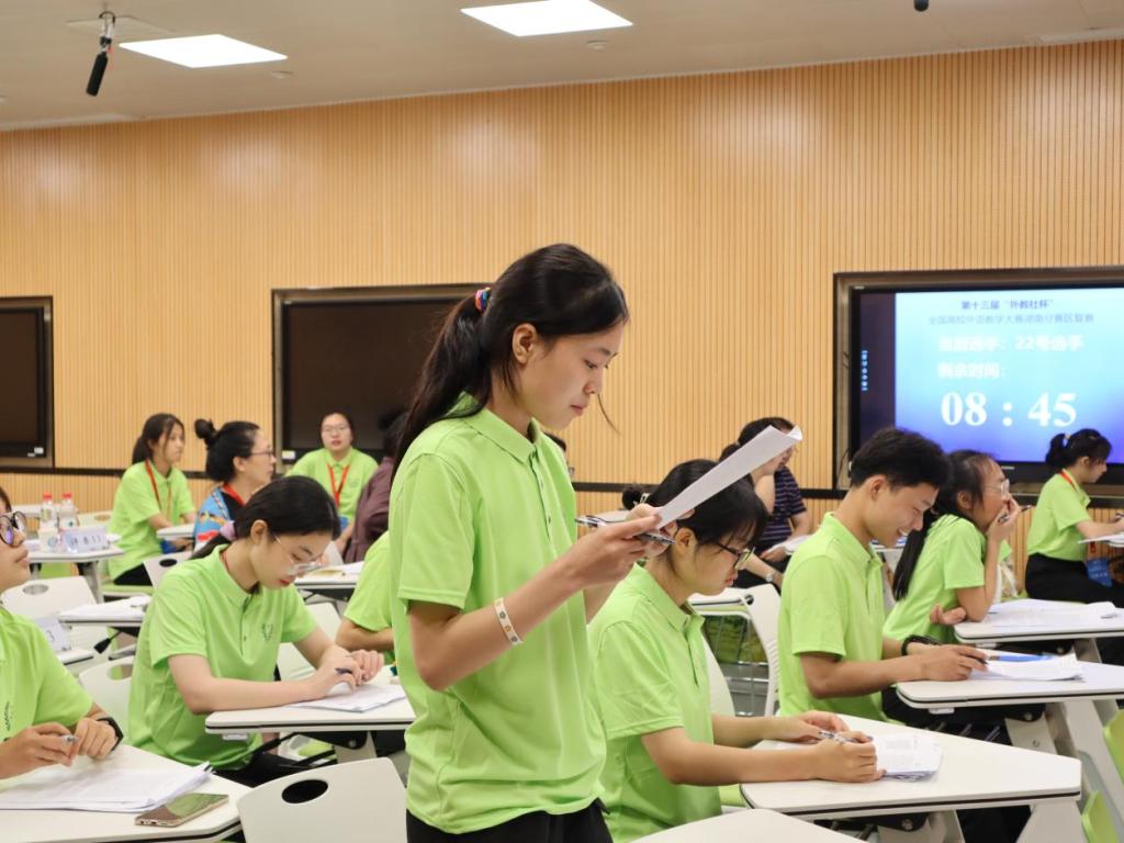“我们赛场的学生都好可爱,特别配合我,学生的综合素质很高,全程下来都挺顺利的,希望能取得一个好成绩!”刚从综合教学楼C区304大学英语综合课组比赛出来的选手章珩跟旁边的选手感慨道。2022年6月18日至19日,第十三届“外教社杯”全国高校外语教学大赛(大学外语组)湖南赛区复决赛暨颁奖典礼在长沙理工大学成功举行。来自湖南省内30所高校的61名专业选手们分别参加到大学英语综合课组、大学英语(视)听说课组、大学日语组三个组别的比赛角逐中。