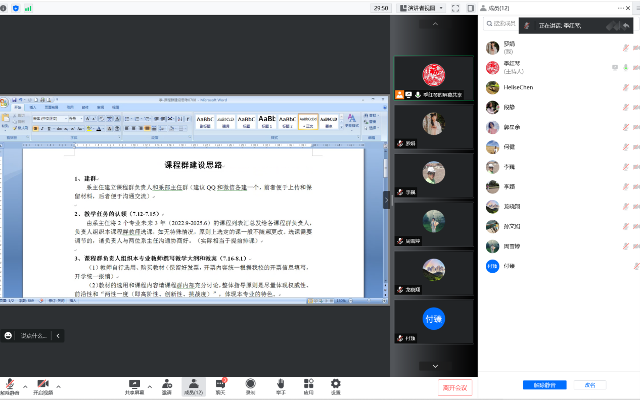 为促进我院教学水平提升,助力教师专业成长,推进课程资源建设,2022711日晚上,外国语学院英语系与翻译系召开了线上课程群建设研讨会,会议由副院长季红琴主持,英语系主任罗娟博士、翻译系主任何健博士和10个课程群负责人参加了本次会议。