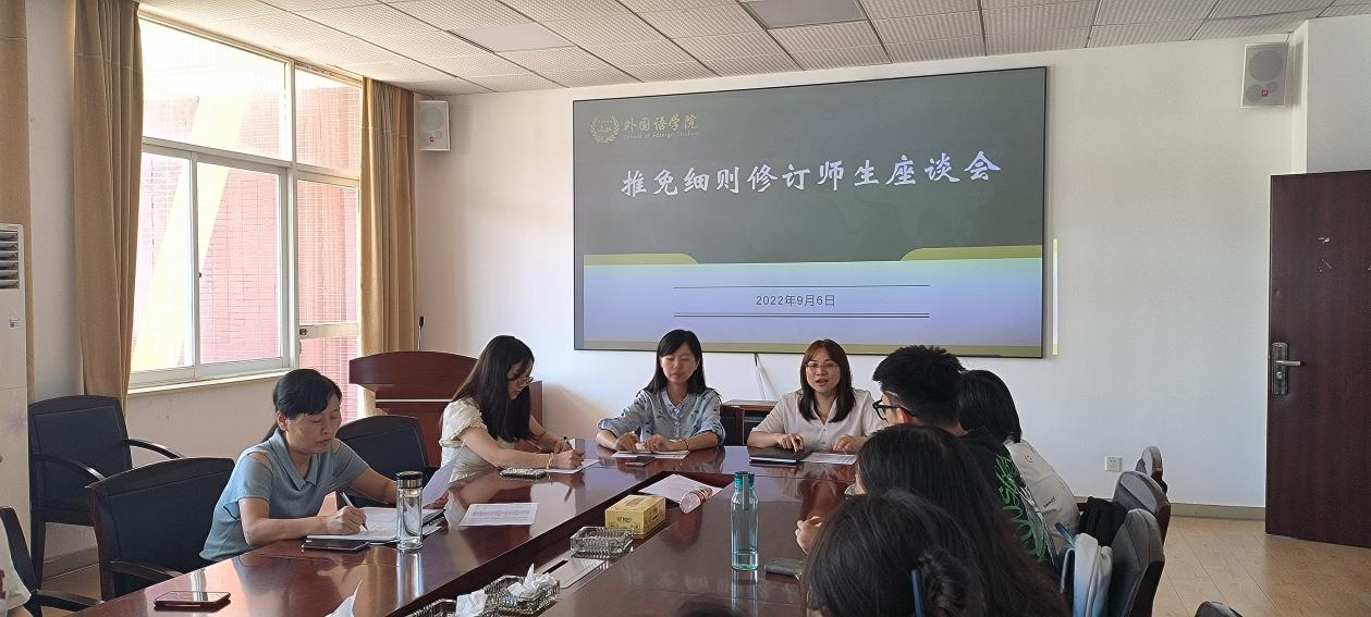 96中午,我院于云塘校区文科楼A603召开外国语学院推免细则修订师生座谈会,学院党委副书记王双、教学副院长季红琴、教务办主任王爱华、学工办辅导员龙洋出席会议,学院19-20级各班学生代表参加座谈会。