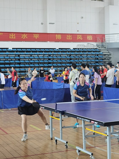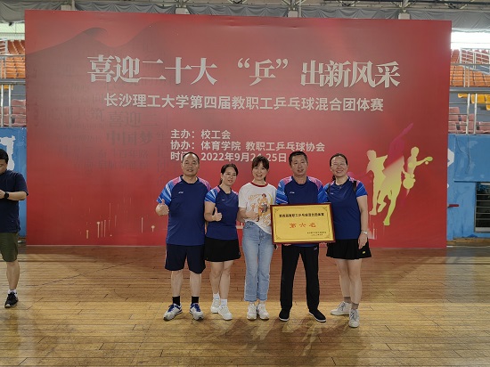 金秋九月,秋高气爽。9月24-25日,由校工会主办,体育学院、校教职工乒乓球协会协办的长沙理工大学第四届教职工乒乓球混合团体赛在云塘校区体育馆激情上演,来自各学院、机关单位的23支代表队共322名教职工,放下粉笔,拿起球拍,一起“喜迎二十大,‘乒’出新风采”。比赛分男子单打、女子单打、男女混合双打、男子双打、女子双打共五个项目进行,经过分组循环赛、交叉淘汰赛,历经两天共67场的激烈角逐,我院老师不懈奋斗、排除万难,在阵容不足、 队员缺少的情况下取得了第六名的好成绩。