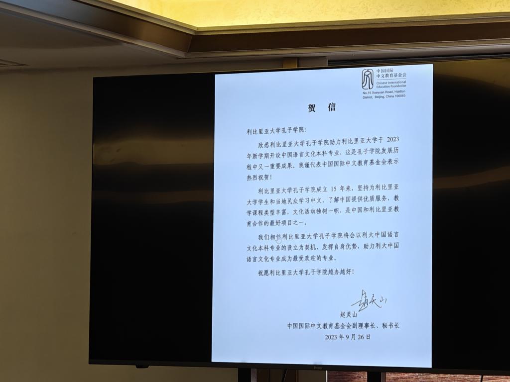 中国国际中文教育基金会和长沙理工大学分别发来了贺信与视频,祝贺中国语言文化本科专业成功设立。中国国际中文教育基金会副理事长、秘书长赵灵山鼓励利大孔院以中国语言文化本科专业的设立为契机,发挥自身优势,助力利大中国语言文化专业成为最受欢迎的专业。长沙理工大学副校长谈传生表示长沙理工大学愿加大支持力度,与利比里亚大学共同携手,把中国语言文化本科专业建设好,为利比里亚社会经济建设和中利友好事业,培养更多优秀的国际化人才。