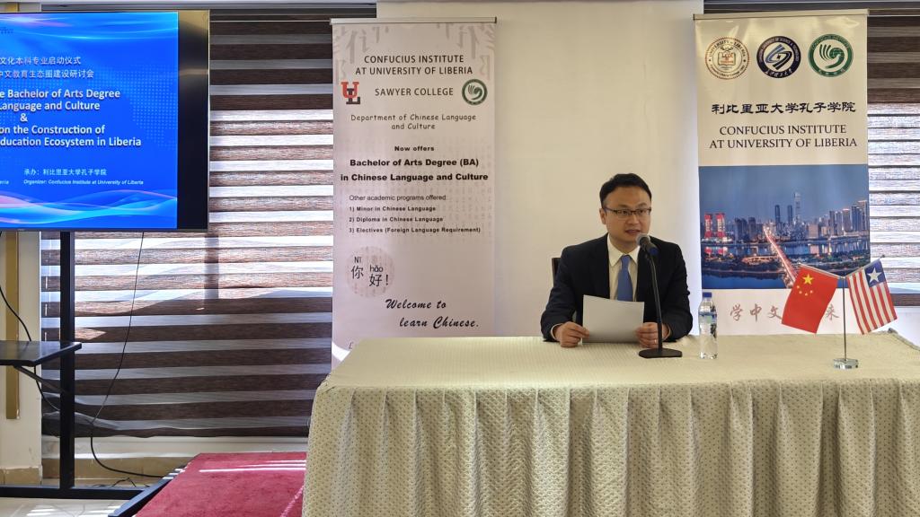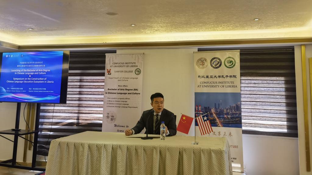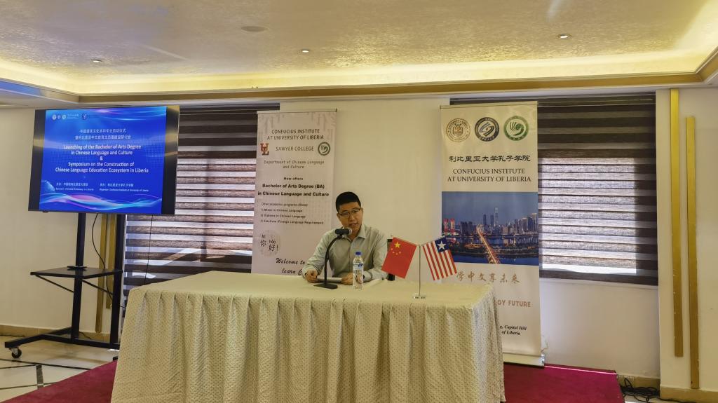 2023年9月26日,利比里亚大学孔子学院成功举办中国语言文化本科专业启动仪式暨利比里亚中文教育生态圈建设研讨会。此次盛会是利大孔院为迎接“孔子学院日”所举行的系列活动之一。中国驻利使馆临时代办范尔为、利比里亚大学校长代表行政副校长Tarr、利比里亚通讯社代社长Kahlai、利大多位副校长、多个学院院长、利大人文社科学院代院长Togar率多个系部主任、在利中资企业和援利医疗队代表、友华团体、利大孔院各教学点等负责人和代表共百余人应邀参会。利国十余家知名电视台、电台、报刊等媒体进行了现场直播和报道。