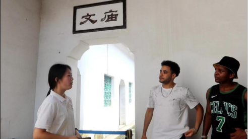 在充满浓厚学术氛围的千年学府岳麓书院,实践团成员用英语向外国友人细致讲解了中国古代的教育文化和岳麓书院在古代传播理学的功绩。红门威严,石狮站岗,壁画精美,在实践团的讲解中,留学生们了解了讲堂、文庙的悠久历史及其重要地位。“爬岳麓山的过程虽然很累,但沿途的风景实在太美了,这座山文化底蕴深厚,让人陶醉其中。”来自阿尔及利亚的宓名善认真聆听着实践团讲述岳麓山的历史故事和文化传说,感触颇深。