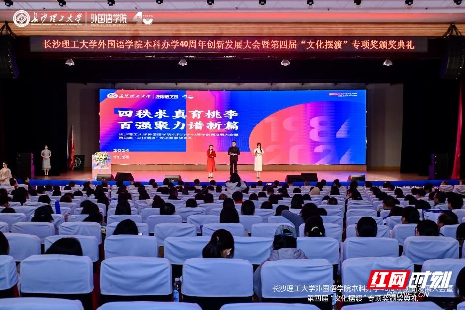 11月24日,长沙理工大学外国语学院在金盆岭校区举办本科办学40周年创新发展大会暨第四届“文化摆渡”专项奖颁奖典礼,以外语之名携手前行,拥抱未来。