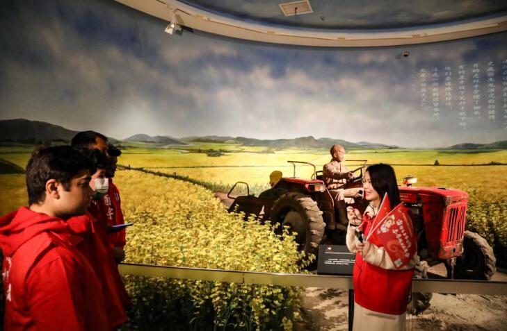 “Good morning, everyone. Now, we’ve come to the exhibition hall of Lei Feng's life story. ”来自英语笔译专业的研究生蒲星宇用流利的英语带领外国友人开启了雷锋生平事迹馆的参观。参观中,雷锋开着拖拉机在团山湖开垦建设的场景引起了留学生的好奇,红色使者团成员秦琪解释到“Lei Feng was a a farm tractor operator,an Anshan Iron and Steel Plant worker, and People's Liberation Army soldier.Wherever he went and whatever he did, Lei Feng always kept lofty ideals and firm faith in mind, and consciously obeyed the needs of the Party and the people. ”生动的讲解了雷锋同志作为拖拉机手建设社会主义新农村的奋斗青春故事。