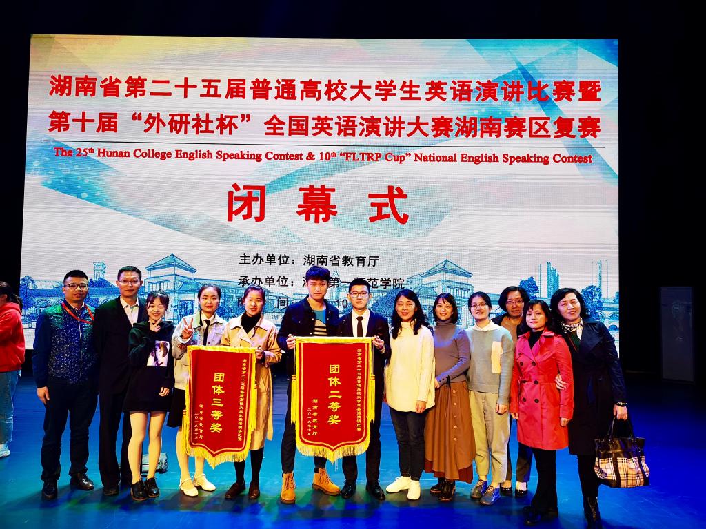 在10月27日结束的湖南省第二十五届普通高校大学生英语演讲比赛暨第十届“外研社杯”全国演讲大赛湖南赛区复赛中,雷竞技官网代表队获得竞赛一组团体二等奖(第一名),城南学院代表队获得竞赛二组团体三等奖。其中雷竞技官网汽车与机械工程学院阳学恒获得非专业组个人一等奖(第二名),经济与管理学院陈颖仪获得非专业组个人三等奖,外国语学院英语1701班陈康获得专业组个人三等奖。城南学院市场营销专业陈宜群,李姗姗获得非专业组个人三等奖,方涵娜获得专业组个人三等奖。指导老师为张志武、刘力、潘莹、孙文娟、彭娅以及王浩萍。
