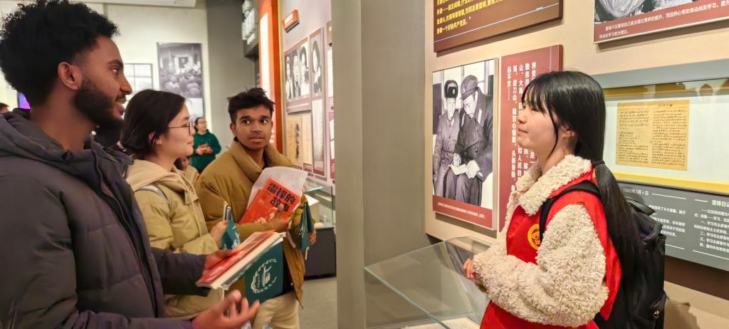 “ ‘Human life is finite, but serving the people is infinite.’ This epitomizes Lei Feng's lifelong creed.”(“人的生命是有限的,可是为人民服务是无限的。”这就是雷锋一生的信仰。)在纪念馆内,“文化摆渡者”志愿服务队成员们发挥专业所长,以流利的英文讲解,带领留学生们循着雷锋的足迹,透过泛黄的历史照片、字迹工整的日记手稿、朴素的生活实物,沉浸式感受雷锋同志短暂却光辉的一生。