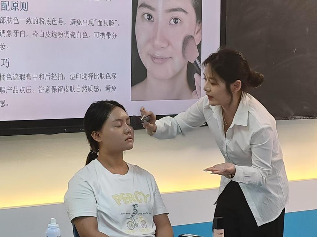 本次活动邀请了文新学院志愿者罗盼和熊思思担任培训师培训内容涵盖了服装搭配技巧、发型设计与打理、面试妆容全解析以及求职礼仪等部分。两位培训师通过生动的讲解和现场演示,向同学们展示了如何根据不同场合选择合适的服装和妆容,以及如何通过发型设计来提升整体形象。在实战演练环节培训师邀请了两名同学上台进行现场化妆演示。培训师一边为为同学现场化妆,一边详细解释每一步的技巧和注意事项,整个演示过程既专业又生动同学们对化妆的步骤和技巧有了更直观的理解。这一环节的设置极大地提高了同学们的参与感和学习效果,使得整个活动更加生动和实用。