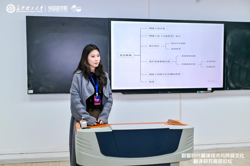 湖南科技大学禹玲教授在分论坛上宣讲了题为湖南大公报特征文学翻译研究学术研究,通过对民国时期湖南《大公报》的翻译文学特征进行分析,探讨了湖南本土报纸中外国文学汉译的特点及其影响。长沙理工大学的刘思利从传播学5W视角出发,研究了湖湘花鼓戏外宣翻译策略与传播途径,为推动中国传统文化走出去提供了新的视角。同样来自长沙理工大学的陈慧则聚焦湘西地区珍贵的非物质文化遗产,以纽马克翻译理论为指引,为非遗的国际传播开辟新路径。此外,北京外国语大学的胡昕以人工智能译文为切入点,对湘赣花炮文化的接受度展开全面分析,为花炮文化的传承与传播提供新视角。