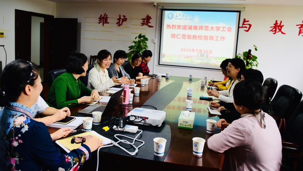 9月18日上午,湖南师范大学工会常务副主席余英、副主席梁蓓蓓、杨格花一行来雷竞技官网工会交流,校工会副主席(主持工作)郭剑、副主席赵爱群、彭霞等同志参加工会工作交流会。