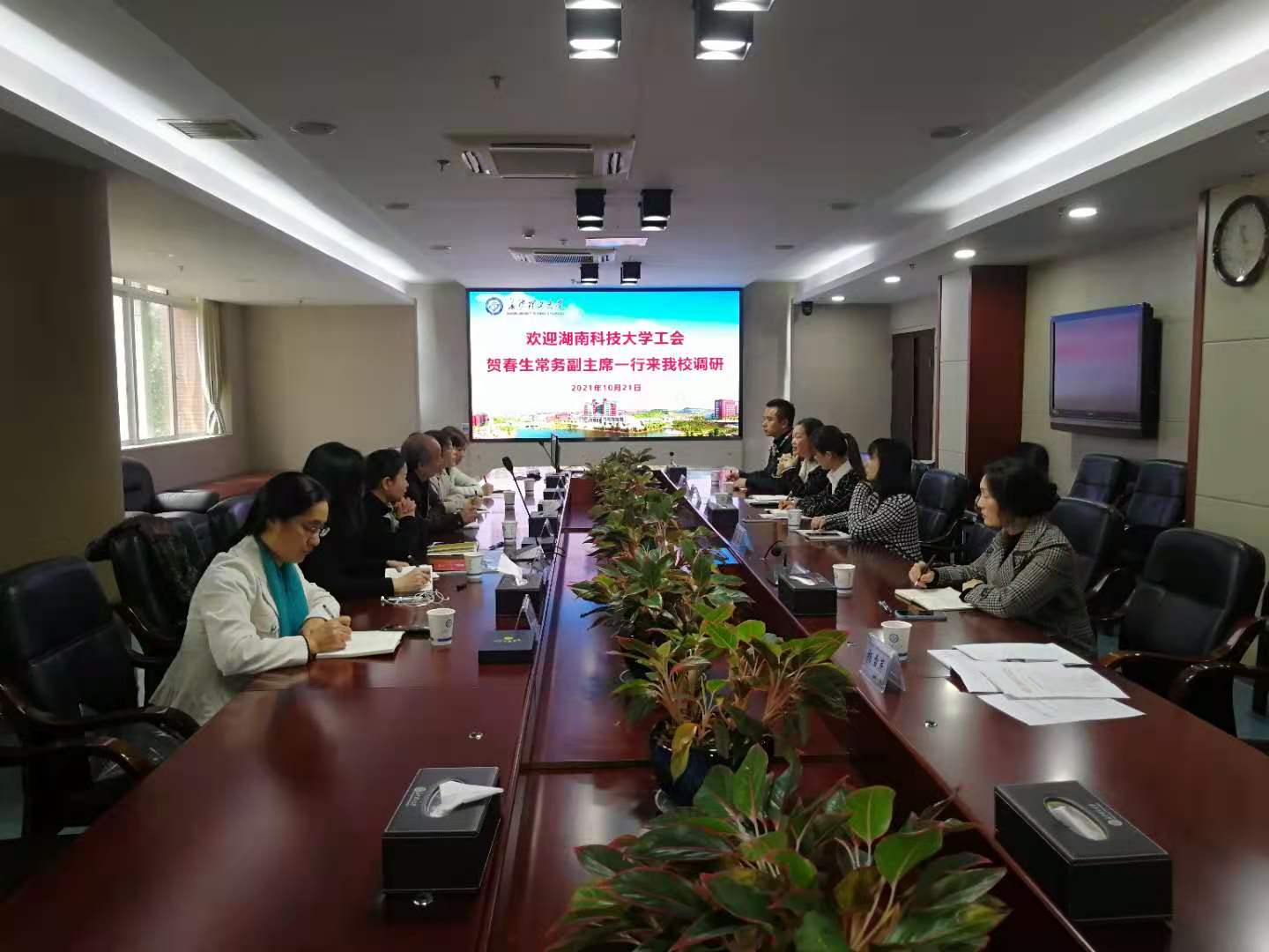 10月21日,湖南科技大学工会常务副主席贺春生、副主席刘婕等一行6人来雷竞技官网交流调研,雷竞技官网工会常务副主席郭剑,副主席赵爱群、彭霞、谭志华(挂职)及工会职能科室人员参加交流。